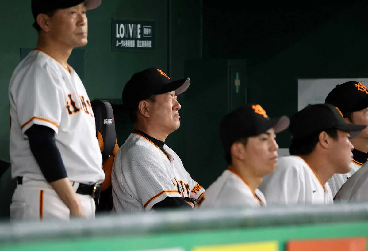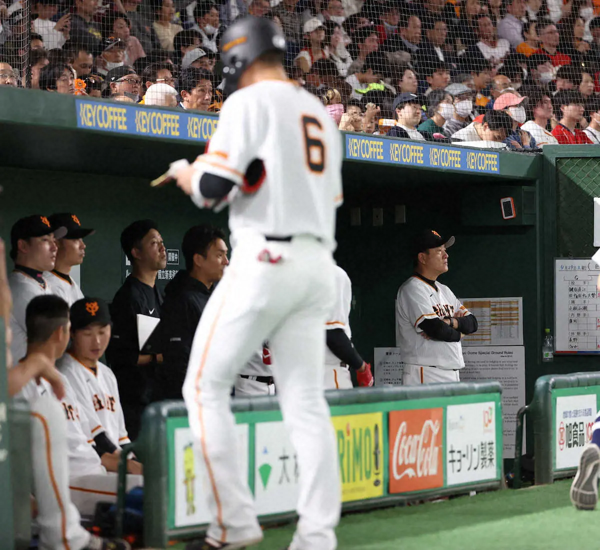 <巨・広>2回、左飛に倒れた坂本(手前)と戦況を見守る原監督(右奥)(撮影・西川 祐介)