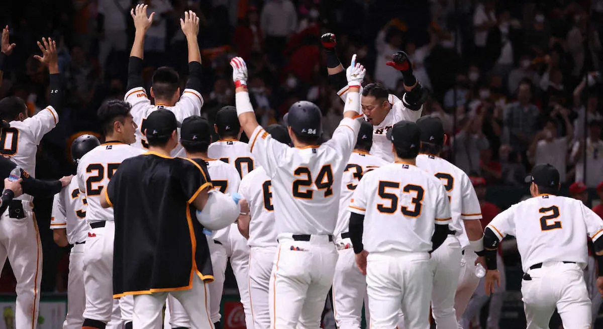<巨・広>7回、秋広がプロ初となるソロ本塁打を放ちベンチが迎える(撮影・篠原岳夫)