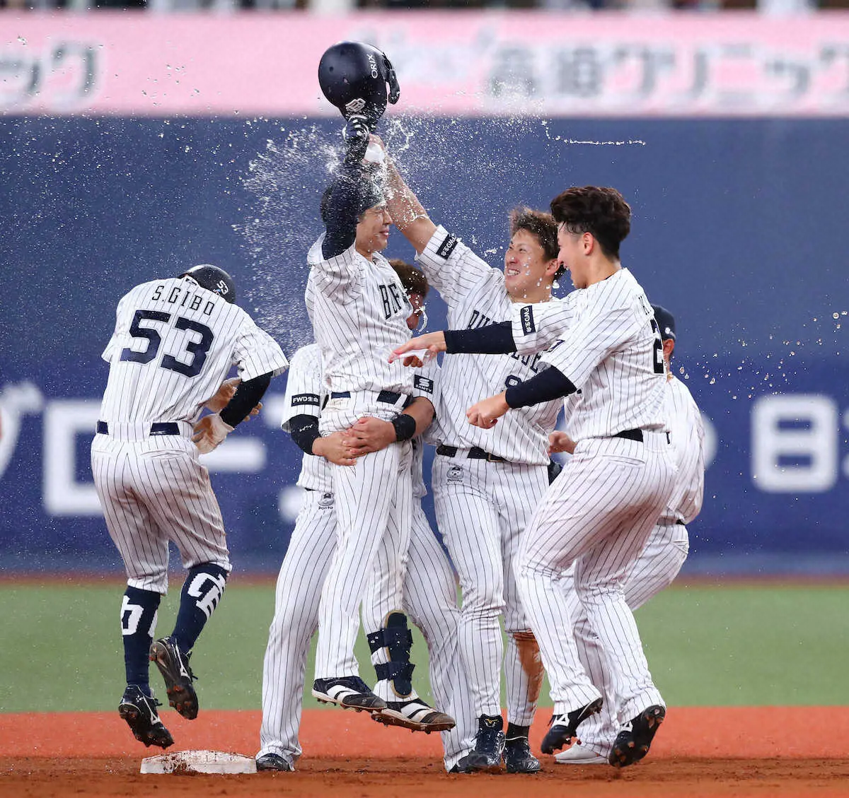 昨年9月15日の日本ハム戦以来となる自身2本目の劇打に「2死から紅林と宜保ちゃんがつないでくれたので、絶対に決めるぞという気持ちで打席に入りました」と笑顔。西武から森が加入し、出場機会は減少しても「(森)友哉が守備のことを聞いてきてくれたり、逆に僕が打撃のことを聞いたり…高め合いながらやれている」と強調した。
