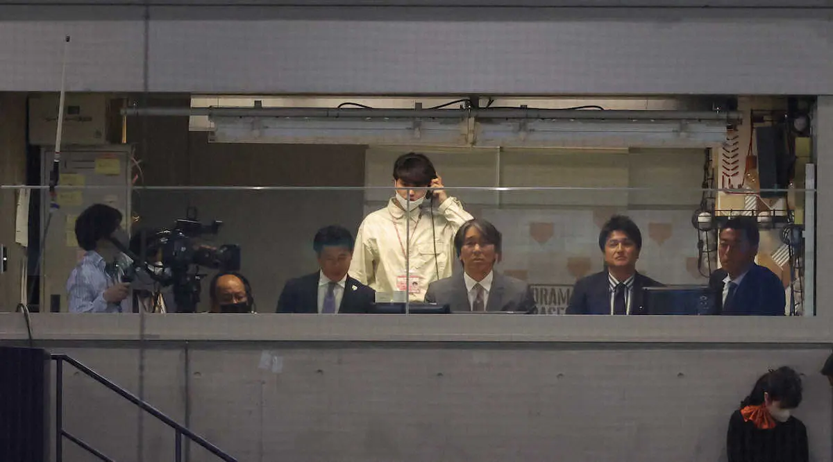 <巨・ヤ>日テレの中継ブースで解説する(右から)上原浩治氏、高橋由伸氏、松井秀喜氏(撮影・藤山 由理)