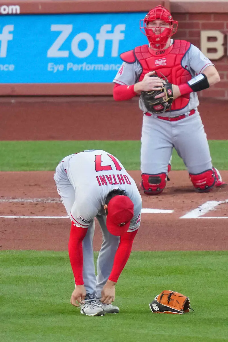 この日の試合では、大谷が何度も見せたある動作も注目を集めた。最初は2回だった。無死二塁、打者カールソンの2ボール2ストライクとなった場面でタイムを要求。かがみ込むようにして右足のスパイクの靴ひもを結び直した。その後も少なくとも2回、マウンドでタイムを取って靴ひもを結び直すシーンが見られた。