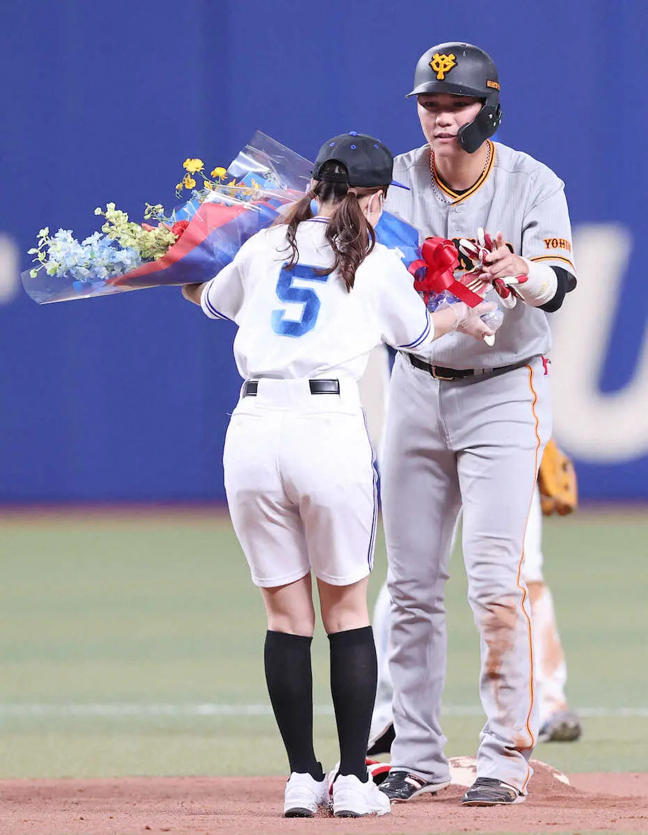 <中・巨>7回、坂本は二塁打を放ち通算3500塁打を達成し、花束を受け取る(撮影・椎名 航)
