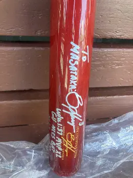 レッドソックス・吉田がブライス・ハーパーからプレゼントされたサイン入りバットとスパイク(撮影・杉浦大介通信員)