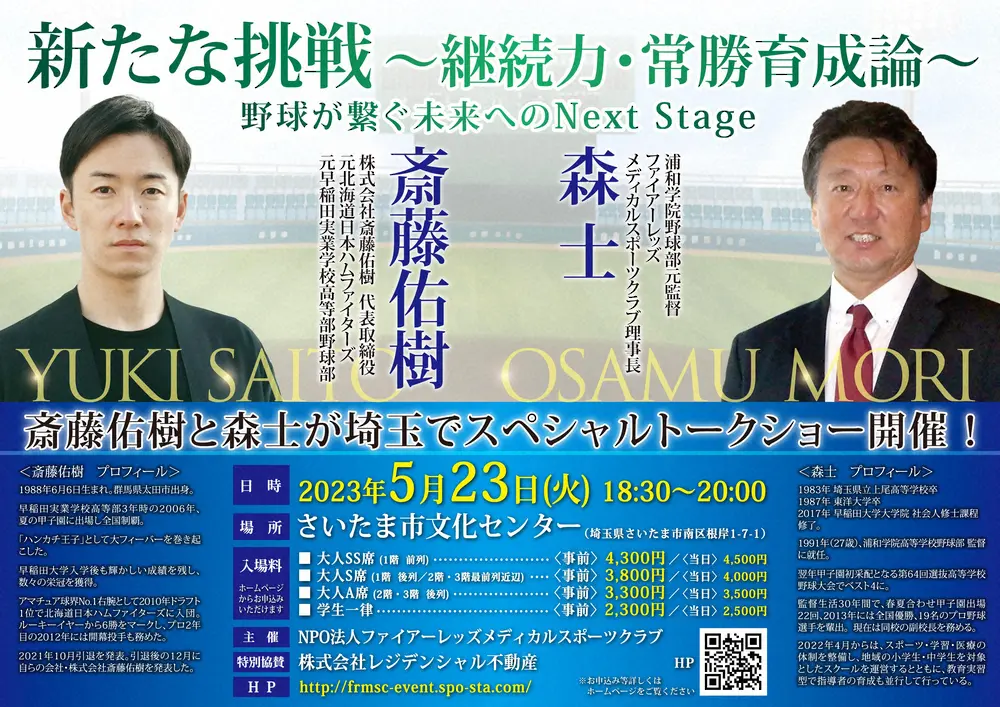 「NPO法人 ファイアーレッズメディカルスポーツクラブ」理事長を務める浦和学院の森士(おさむ)前監督(58)と元日本ハム・斎藤佑樹氏(34)のトークショーが23日午後6時半から、さいたま市文化センター)で開催される。