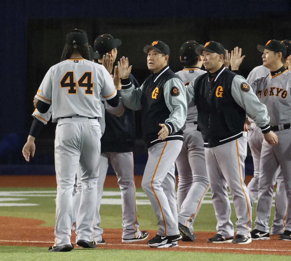 門脇を三塁に起用。主砲の岡本和を一塁に置いた。その門脇が活躍し、岡本和も同点ソロを含む2安打2打点。足も絡めてDeNA先発のバウアーに対して11安打を浴びせたことに「どんなピッチャーにでも対策して。そうやってね、結果が、ちょっと結果がいいとそう見えるんでしょうけど、まあ、上手い具合にと思いますね」と語った。