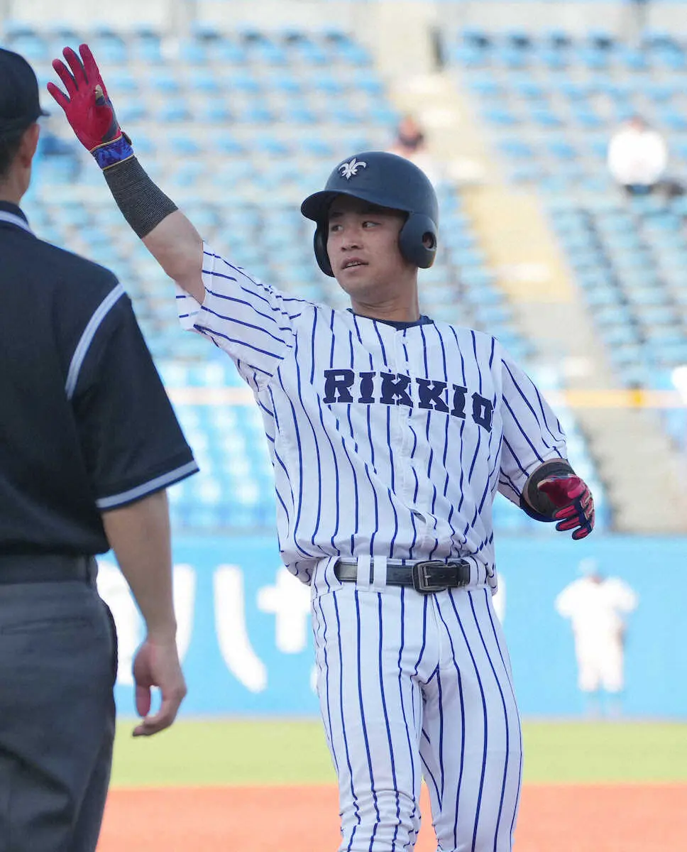 <東大・立大>7回、勝ち越し2点適時三塁打を放ち、スタンドのチームメートに手に上げる立大・西川晋(撮影・木村 揚輔)