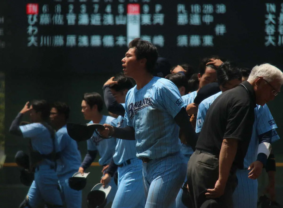 前日の1回戦は12安打10得点を挙げて7回コールド勝ち。一転、行き詰まる接戦を制し、元ソフトバンク、ロッテの山田秋親監督は「なかなか点が取れない試合になると予想していた。植松が初先発でよく投げてくれた。(湯浅は)3番が犠打をして迎えた打席の意味を理解してくれたのだと思う」とナインを称えた。