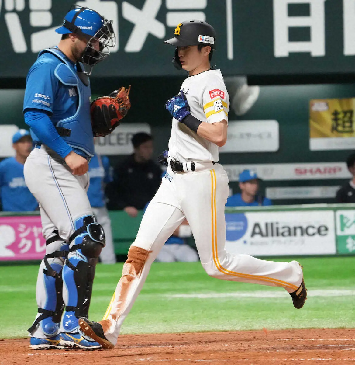 <ソ・日8>3回、近藤の犠飛で生還する三走・周東(撮影・岡田 丈靖)