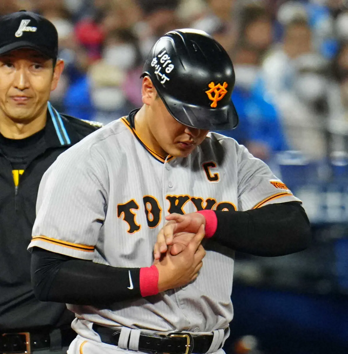 左手小指の下から手首付近にかけて当たったと見られ、岡本和は痛みに顔をゆがめて苦悶の表情。ベンチからはトレーナーと、阿部コーチら複数のコーチが駆け付けて心配そうに見守ったが、そのまま一塁へ歩いた。