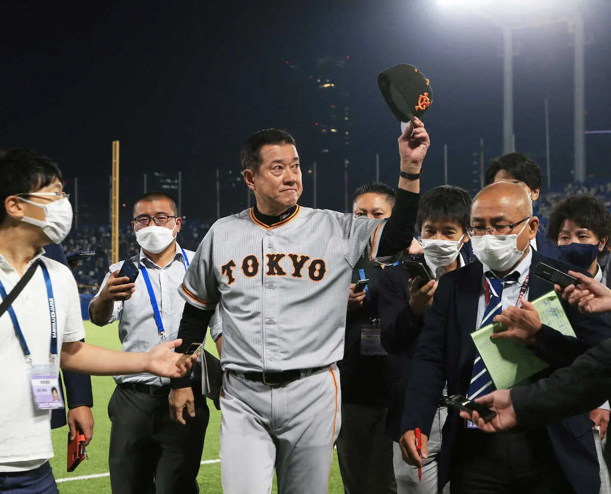 <ヤ・巨>試合後の原監督はファンの声援に応える(撮影・西川祐介)