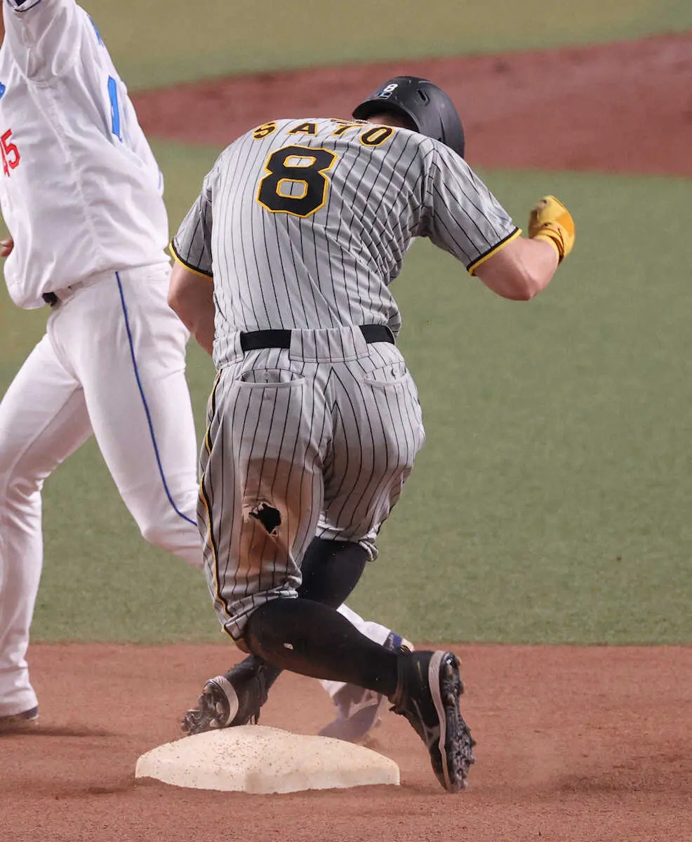 阪神・佐藤輝の“足スト”から貴重な3点目が生まれた。2点優勢の6回、先頭打者で右前打を放つと、次打者・島田の初球にスタート。リーグ2位タイとなる今季4個目の盗塁を成功させ、瞬く間に得点圏の好機を演出した。