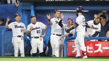 <ヤ・巨>3回、先制ソロの内山を出迎えるヤクルトナイン (撮影・西川祐介)