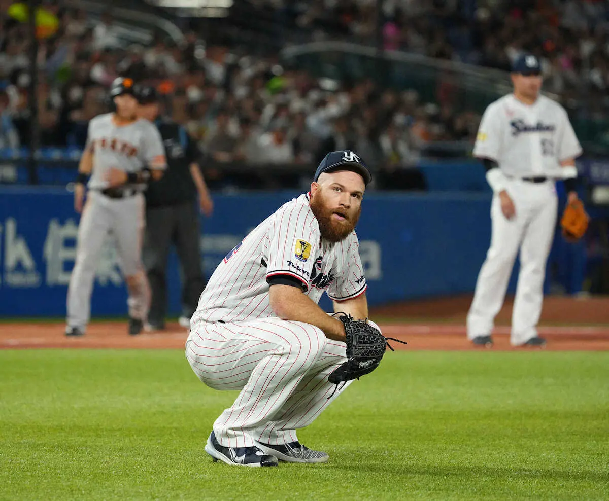 <ヤ・巨>5回1死一塁、横川の送りバントをサイスニードが一塁に送球もベースに誰もおらず頭を抱える(撮影・沢田 明徳)