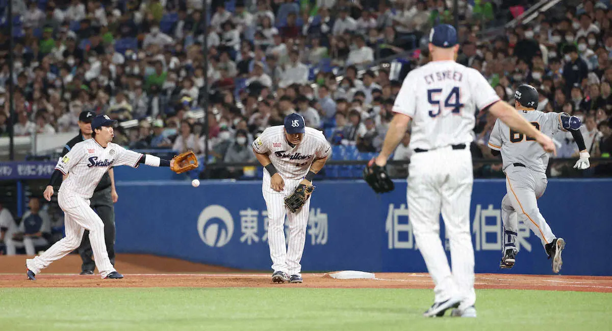 <ヤ・巨>5回、横川のバントをサイスニードが一塁へ送球するもオスナがしゃがみ込み、山田(左)が飛びつくも捕れず (撮影・西川祐介)