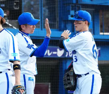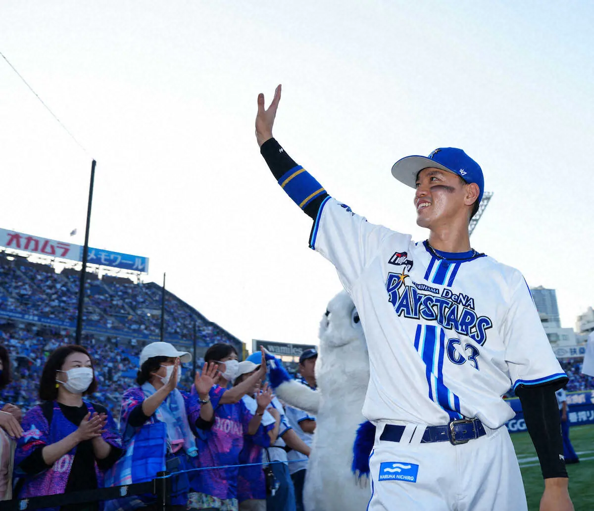<D・ヤ>3回、宮崎の適時打で生還した関根はナインに迎えられ笑顔(撮影・島崎忠彦)