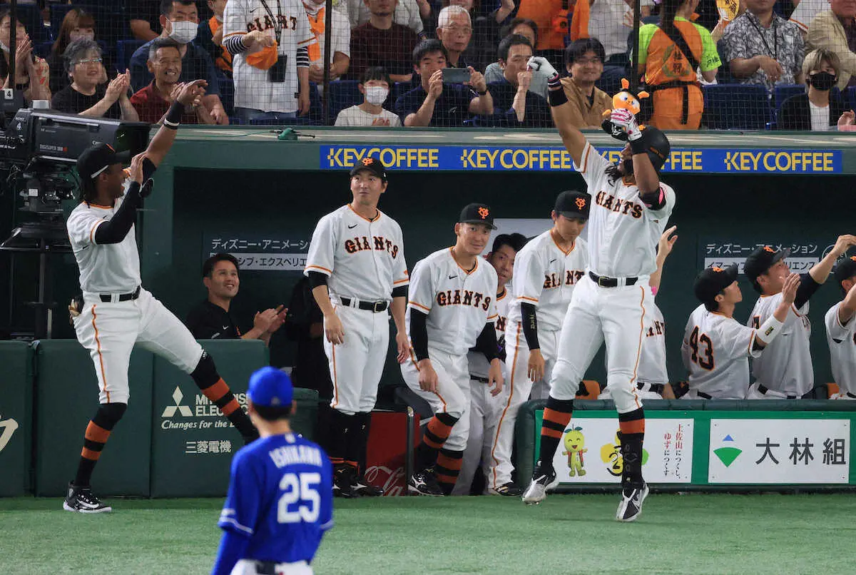 <巨・中>2回、先制2ランを放ったウォーカー(右)はブリンソンとパフォーマンス(撮影・尾崎 有希)