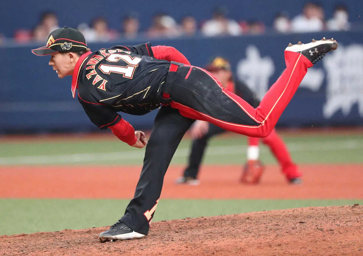 4―10の8回に登板。ポーカーフェースで腕を振った。「投手は試合の流れに左右されてはいけない」。先頭の宜保を外角スライダーで一ゴロに抑えると、続く代打・広岡は低めスライダーで空振り三振。最後は茶野を外角低めスライダーで、空振り三振に仕留めた。13球で打者3人から2三振を奪って3者凡退。最速148キロの直球とスライダーを主体で封じ「ゼロで帰ってこられたので良かった。内容は出来過ぎた方かな」と振り返った。