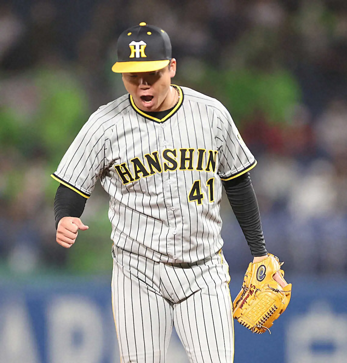<ヤ・神>6回、ヤクルトの村上を三振に仕留め、雄叫びをあげる阪神・村上(撮影・平嶋 理子)