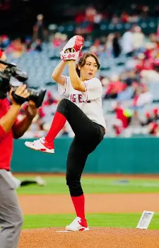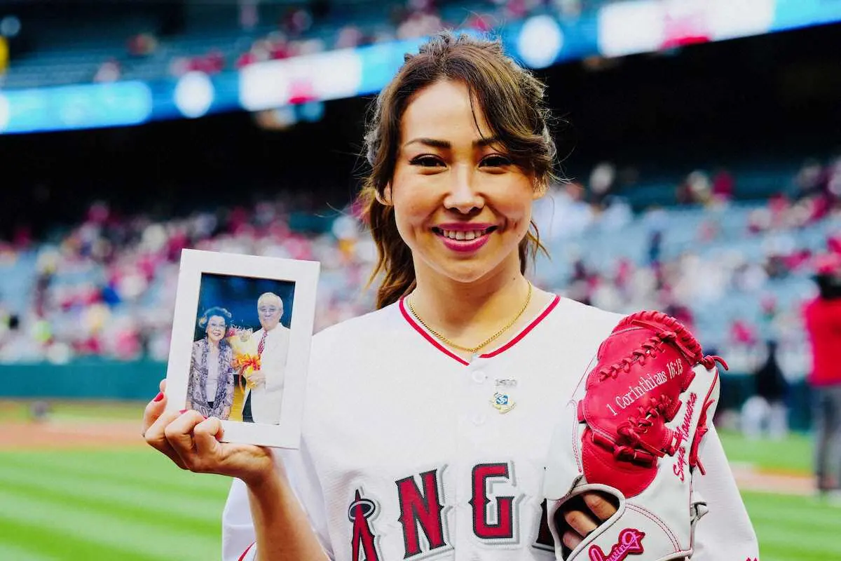 野村克也さんの孫、沙亜也さんがエンゼルスタジアムで始球式 ワンバンド投球も笑顔
