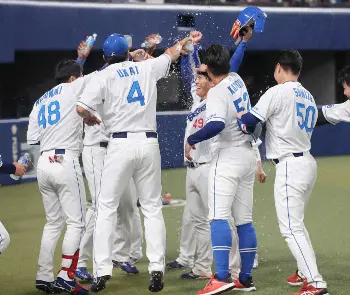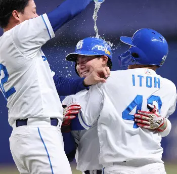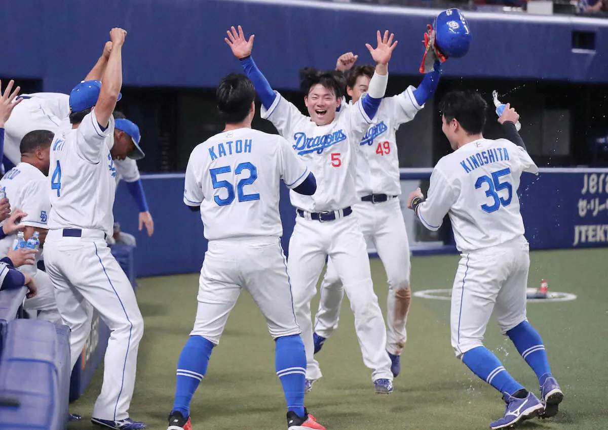 <中・D>本塁のリクエストも判定変わらずセーフとなり、好走塁でサヨナラ勝利を呼び込んだ伊藤(中央)も手荒い祝福を受ける(撮影・椎名 航) Photo by スポニチ 中日・村松 大豊以来!34年ぶりの球団新人サヨナラ打 2度リクエストも“W… ギャラリーで見る この記事のフォト 2023年05月28日の画像一覧 もっと見る 2023年05月28日の画像をもっと見る