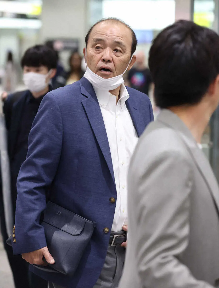 新大阪駅から東京行きの新幹線に乗り込む岡田監督(撮影・大森 寛明)