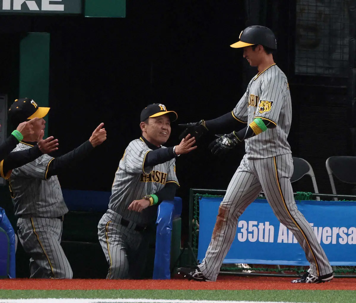 初回無死三塁、先制のホームを踏んだ近本を笑顔で迎える岡田監督(撮影・大森 寛明)