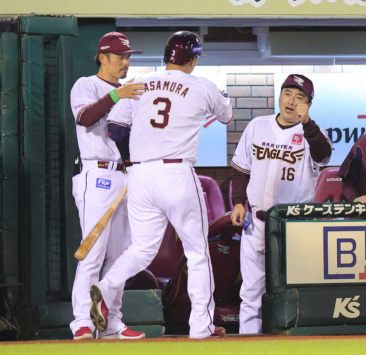 <楽・D>9回、この試合2本目となるソロを放った浅村(中央)を迎える石井監督(右)(撮影・光山 貴大)