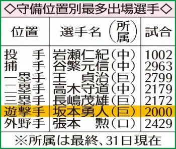 西武の前監督でスポニチ本紙評論家の辻発彦氏(64)が、遊撃として2000試合出場を達成した巨人・坂本について言及。二塁手として歴代9位の1458試合に出場した自身の経験を踏まえ、「大あっぱれ」と絶賛した。