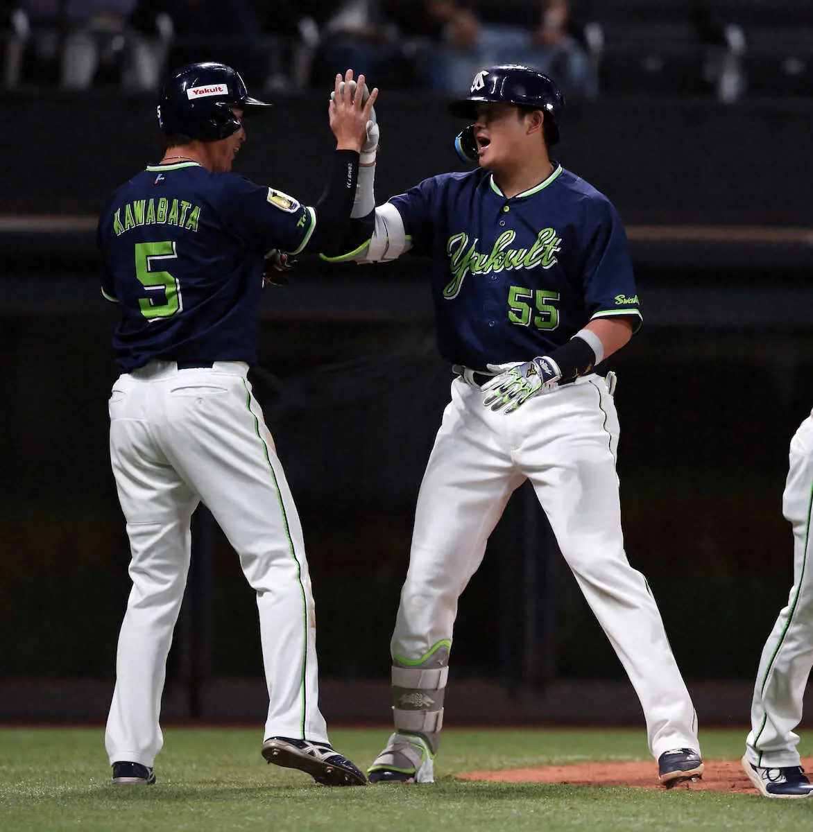 交流戦<日・ヤ>3回、2ランを放った村上(右)とタッチを交わす川端(左)