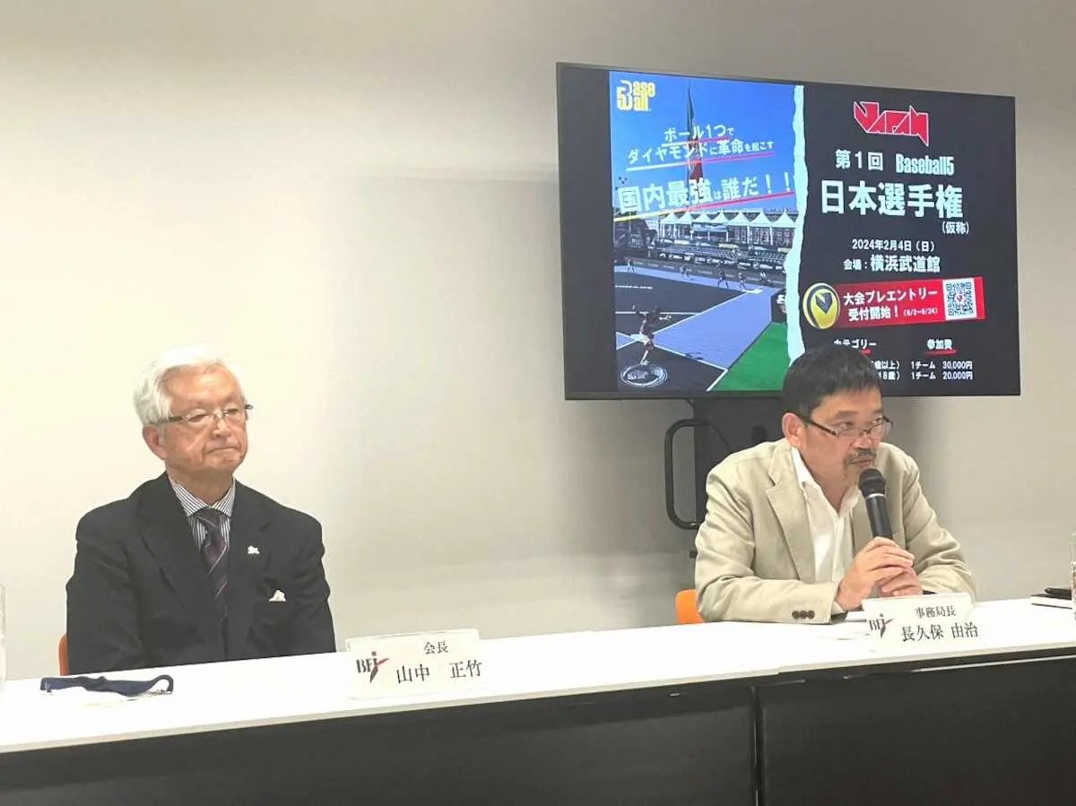 全日本野球協会(BFJ)は1日、都内で会見し、男女混合5人制の手打ち野球「ベースボール・ファイブ(B5)」の第1回日本選手権を来年2月4日に横浜武道館で開催すると発表した。