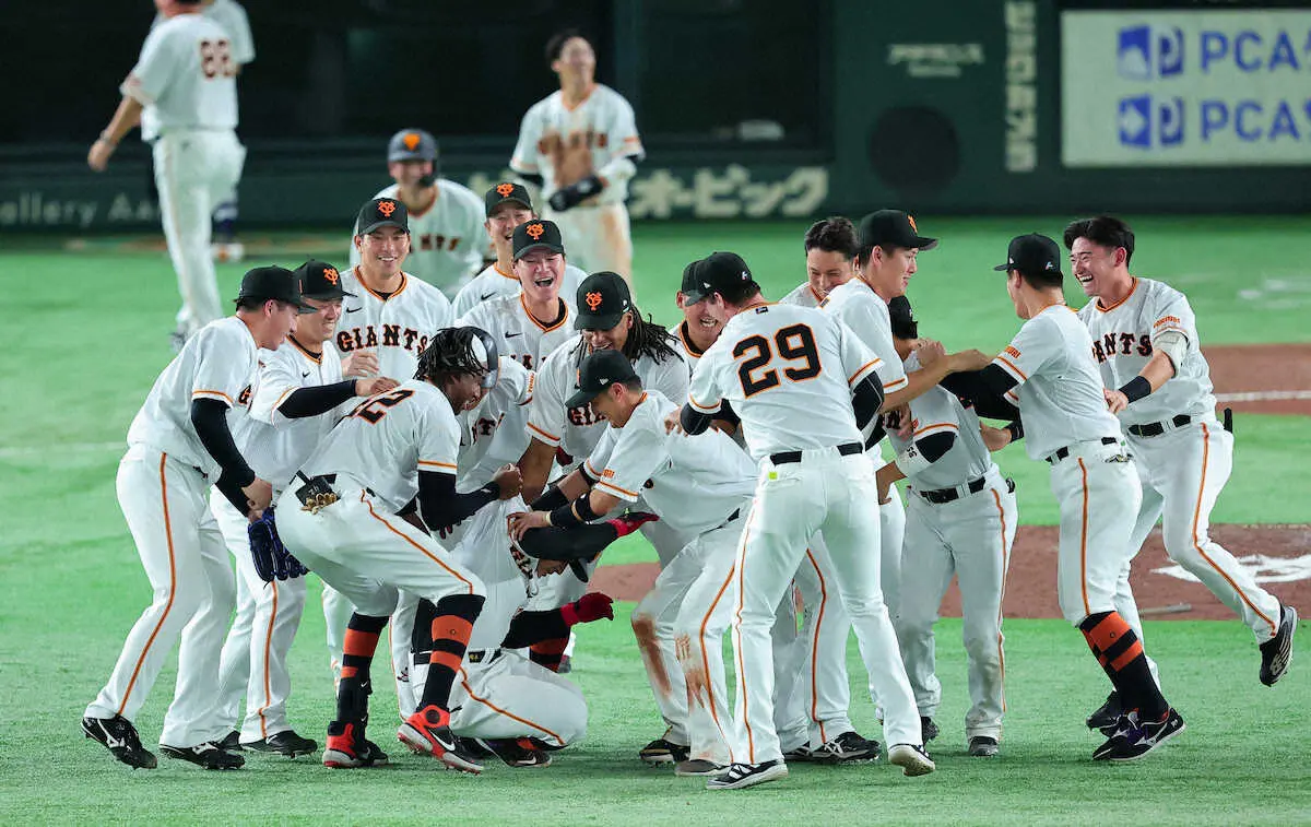 速すぎるサヨナラ劇にウオーターシャワーも間に合わなかった。巨人・岡本和は二塁ベース付近でもみくちゃ。延長10回無死一塁から初球を左翼線へ運ぶと一塁走者の重信が生還。この回わずか2球でのサヨナラ劇に「普通は水じゃないですか。気づいたら地面に倒れ込んであんなんなってた。シゲさん(重信)が速すぎました。びっくりしました」と笑顔が絶えなかった。
