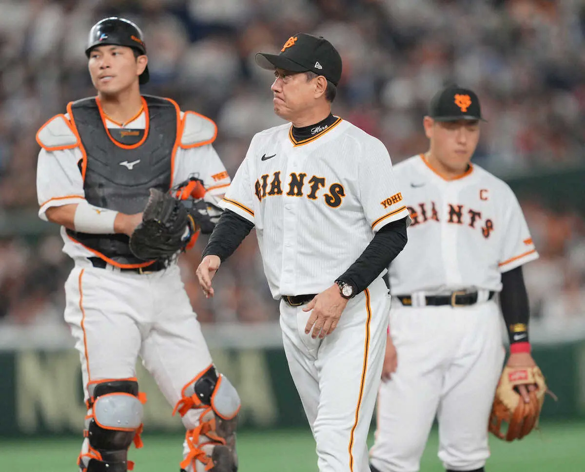 <巨・日>6回、鍬原を交代させ厳しい表情の原監督(中央)(撮影・木村 揚輔)