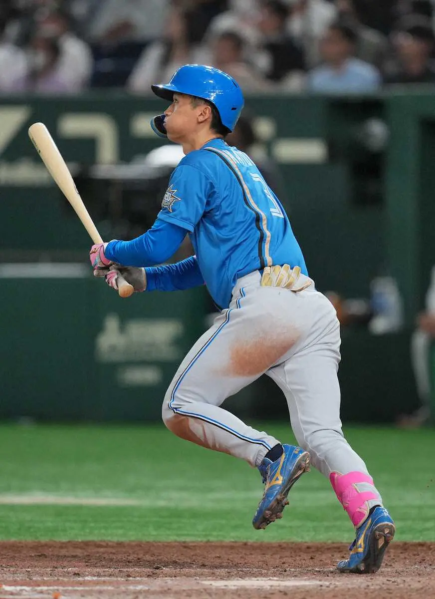 18年に同僚・清宮がつくった7戦連続安打を更新。右脇腹の故障で出遅れた後の記録に「本当にタイミング良く2軍から1軍に来ただけ」と笑った。打率.406と好調もキープ。「今からすぐ(清宮に)LINEします。英語で“I beat you(俺が勝ったぞ)”ってね」とご機嫌だった。