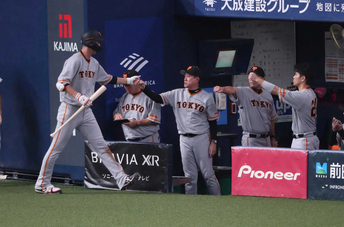 <オ・巨>延長10回、安打を放った秋広とグータッチする原監督(中央) (撮影・須田 麻祐子)