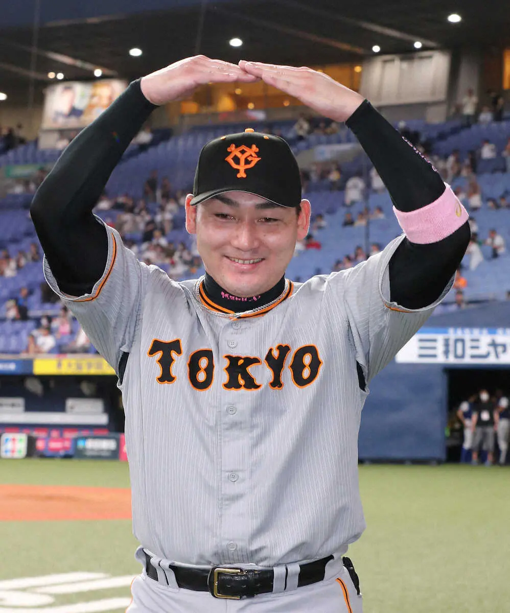 <オ・巨>丸ポーズで喜ぶ丸(撮影・成瀬 徹)