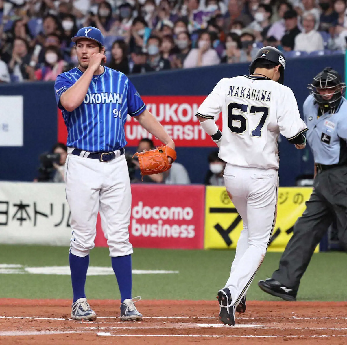 さらにボールが三塁側ファウルゾーンを転々とする間に、二塁走者・中川圭が一気に三塁を回って生還。ホームにベースカバーに入ったバウアーも思わずあ然とする表情を見せた。