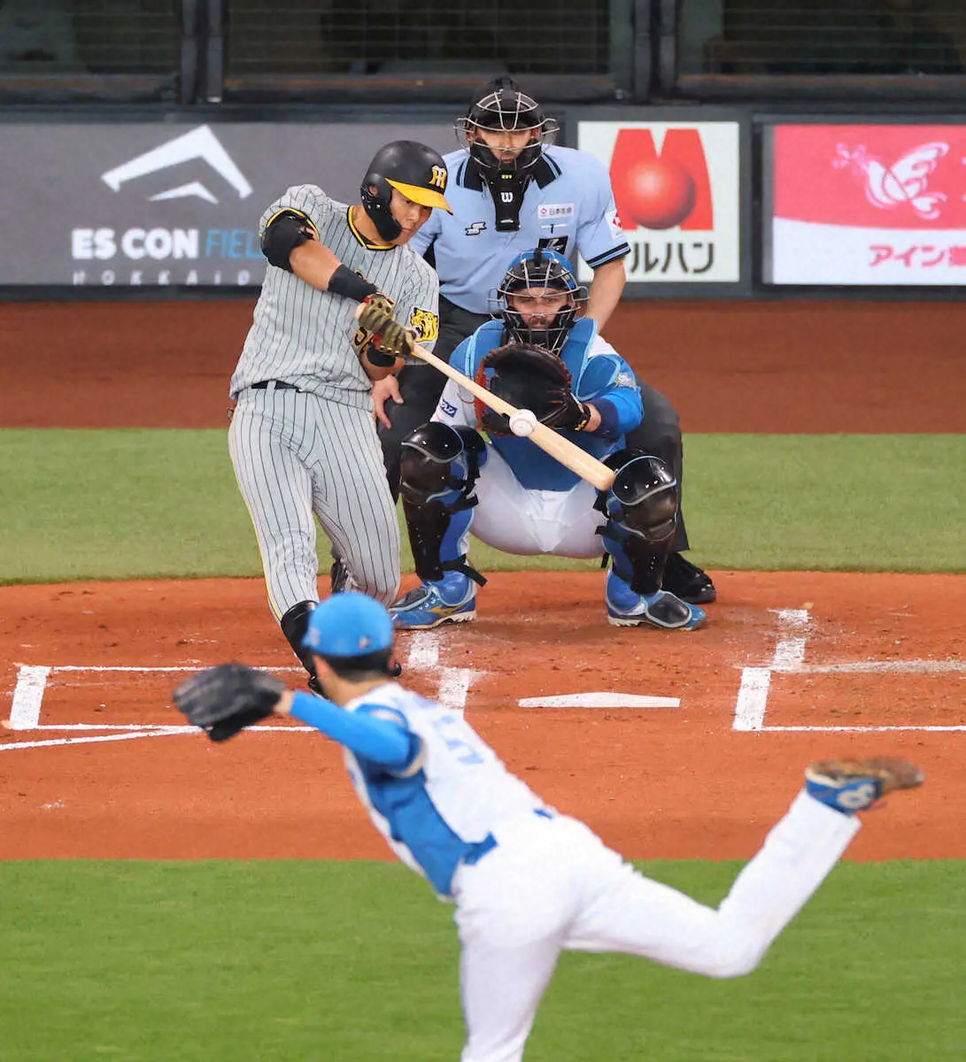 阪神高卒2年目・前川の勢いが止まらない。前日にプロ初適時打を放った若武者はこの日、不振の佐藤輝に代わって5番に抜てき。いきなり2回1死の1打席目に日本ハム・北山の直球を捉えると、大きな放物線を描いた打球は右翼フェンスに直撃した。