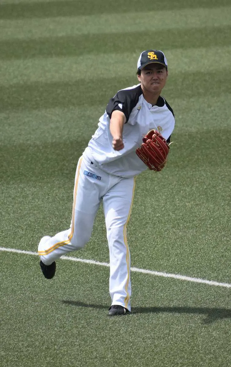 残りのシーズンに向け「まずは4軍の先発で試合をつくれないと2軍は遠いと思うので、課題をつぶしながらケガをしないようにやっていきたい」と井崎。目をギラギラさせながら筑後で汗を流している。(杉浦 友樹)