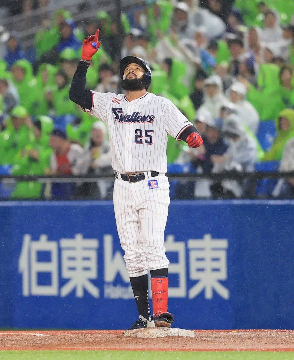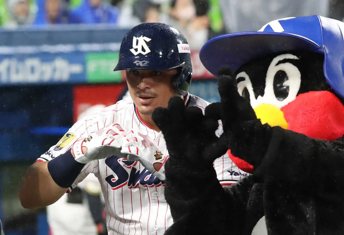 <ヤ・ソ>8回、同点ソロを放ったオスナはつば九郎とカメラに向かってポーズ(撮影・村上 大輔)