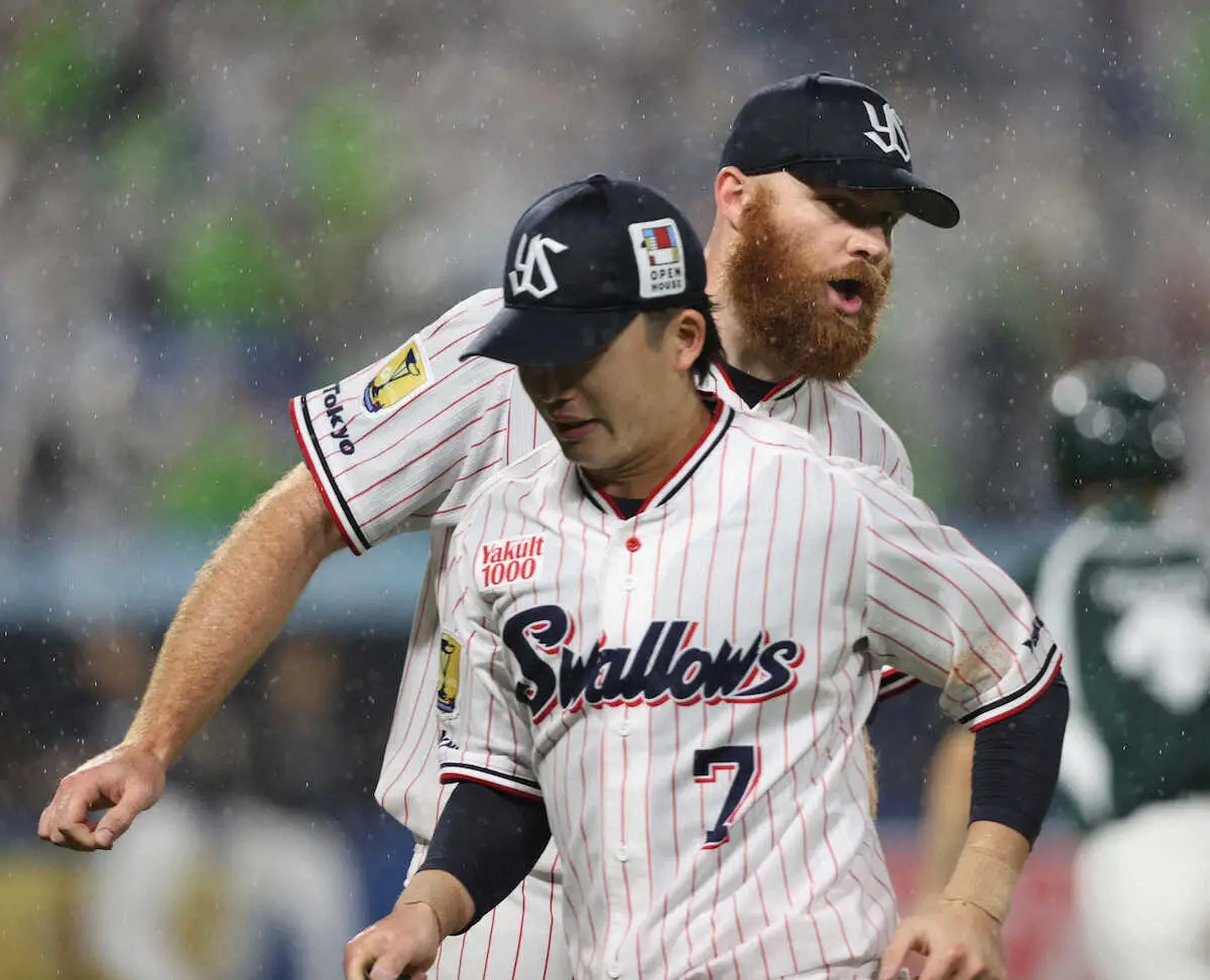 <ヤ・ソ>4回、好守備の長岡(手前)をねぎらうサイスニード(撮影・村上 大輔)