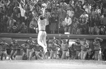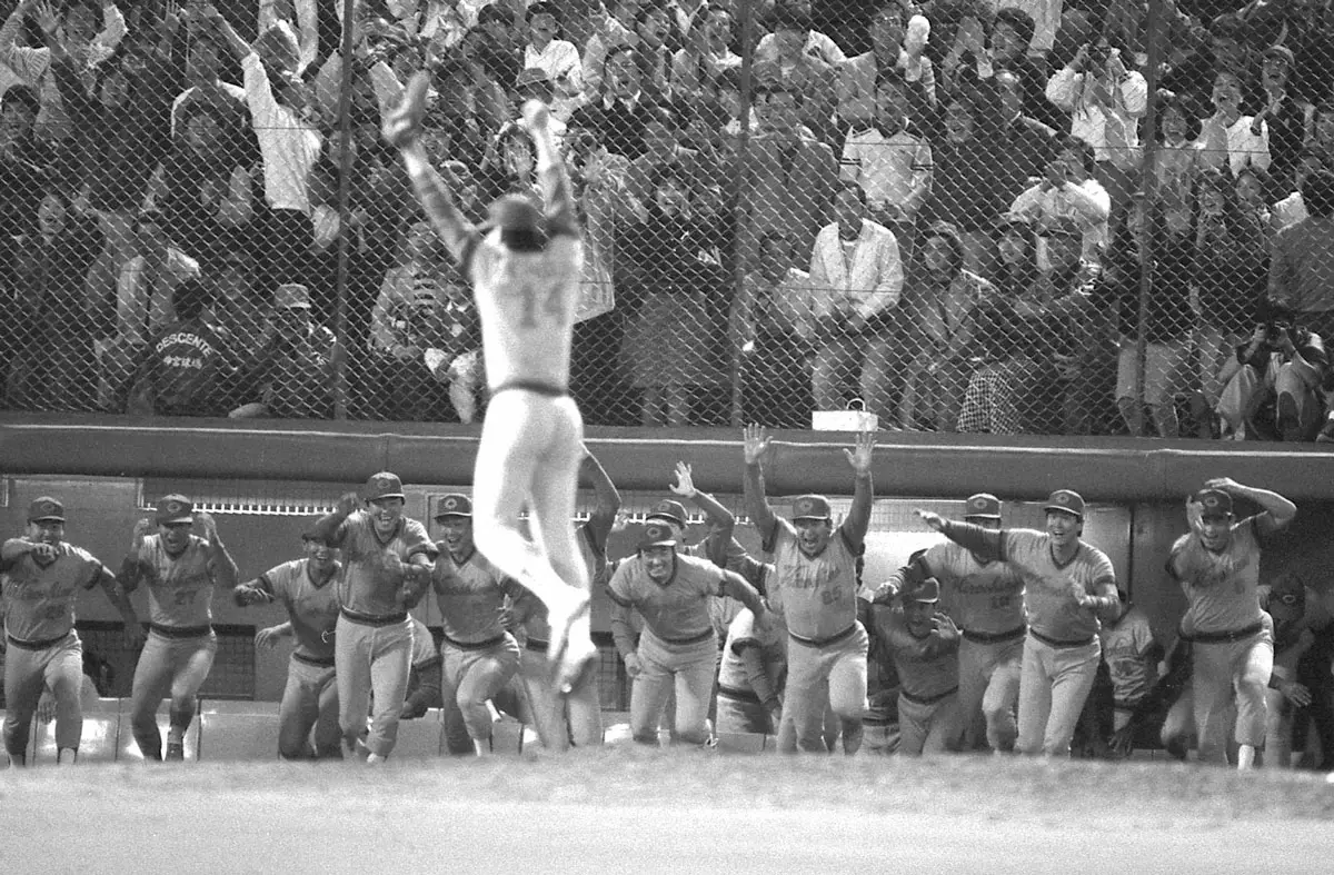リーグ優勝を決めジャンプして喜ぶ広島・津田恒実(14)とベンチを飛び出す北別府学ら歓喜のナイン(86年撮影)
