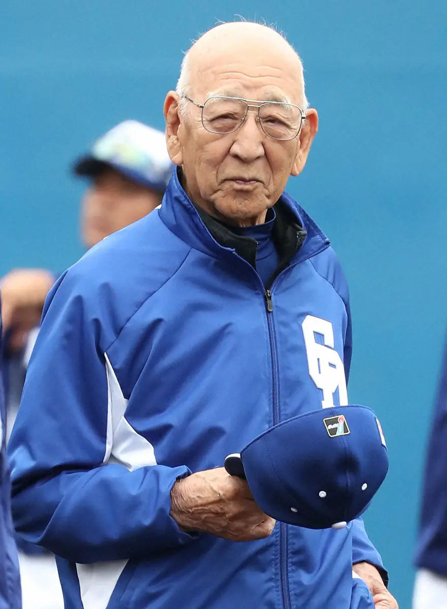 2019年2月、中日―ヤクルトの練習試合の試合前、帽子を取って笑顔を見せる杉下茂氏