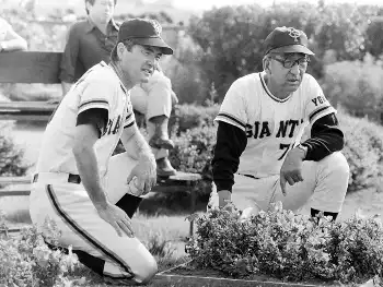 巨人コーチだった1977年7月、長嶋監督(左)と練習を見守る杉下茂氏