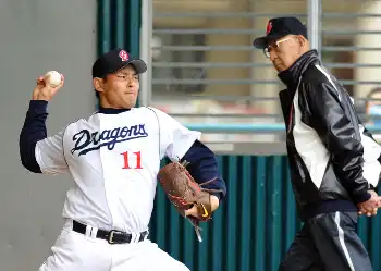 2012年2月の中日北谷キャンプで、杉下茂氏(右)が見守る中、投球練習をする川上憲伸投手