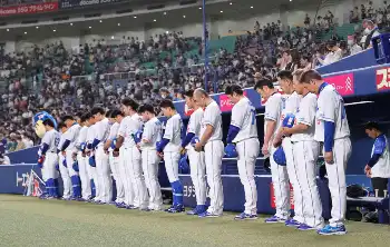 <中・日>先日亡くなった杉下茂さんをしのび、黙とうを捧げる立浪監督(右)ら中日ナイン(撮影・椎名 航)