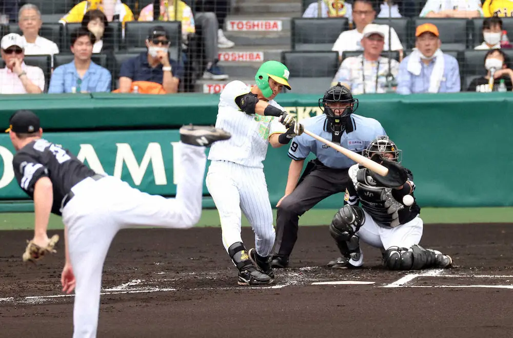 この日は18年MLBドラフト1位だった右腕を目的にメジャーの複数球団が視察に訪れている中、阪神が誇るプロスペクトが初回に存在感を示した。