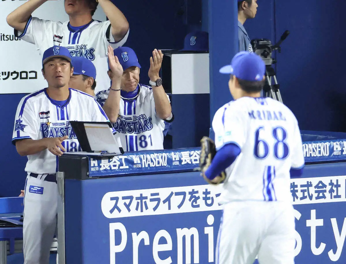 <D・日>5回、好リリーフの森原(右)を拍手で迎える三浦監督 (撮影・白鳥 佳樹)