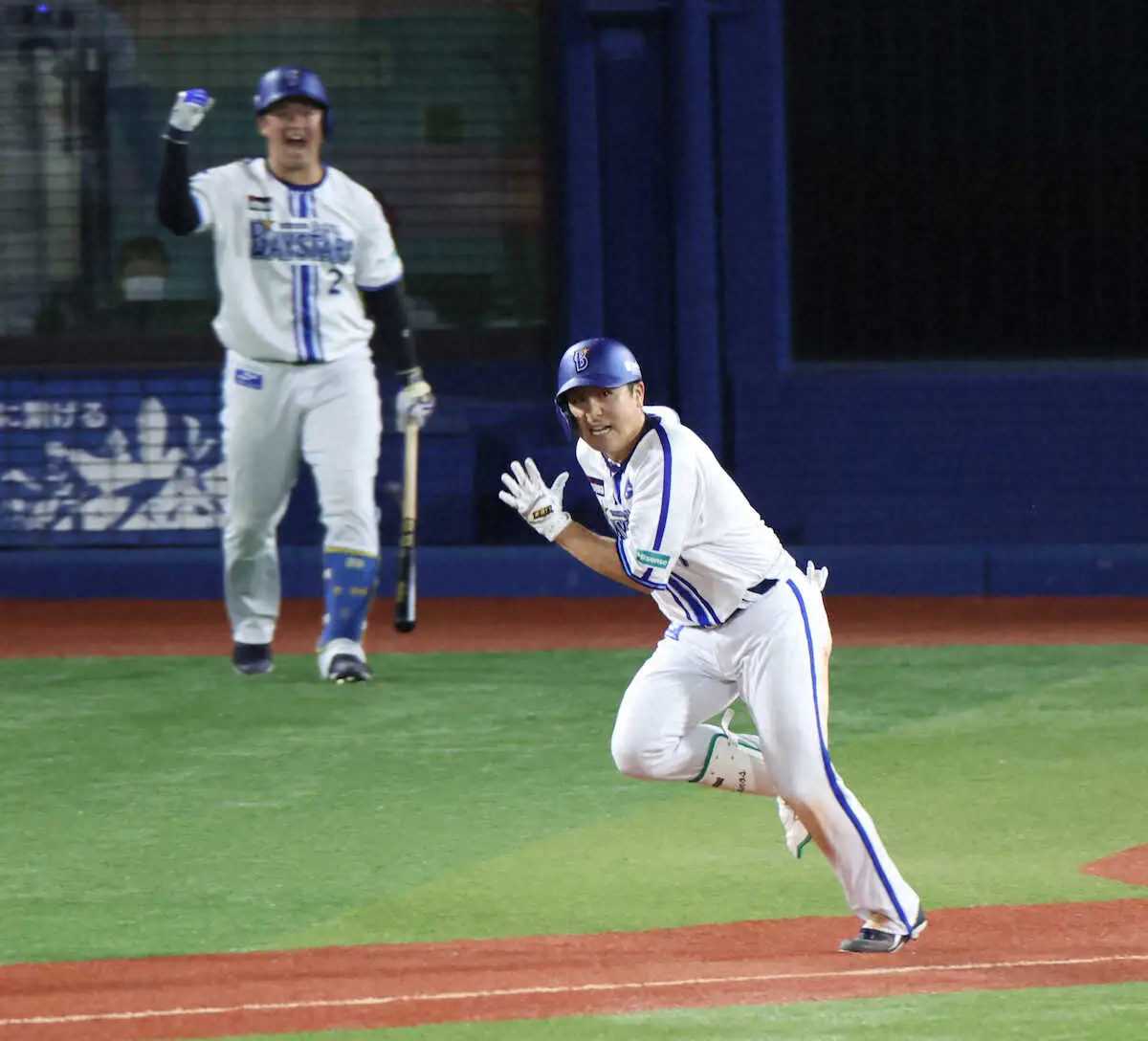 <D・日>7回、2点適時打を放つ佐野とガッツポーズの牧(撮影・白鳥 佳樹)