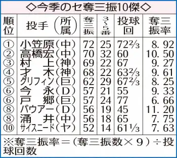 高橋宏は昨年高卒2年目で1軍デビューしたが116回2/3を投げ、134奪三振。規定投球回数(143回)に届かなかったものの奪三振率は10・34と高い数字を残した。今季は19日現在、規定投球回に3イニング足りない。それでも奪三振は同僚の小笠原(72奪三振)に次ぐリーグ2位の70奪三振。奪三振率は10・50と10・00以上をキープしている。セの奪三振10傑で奪三振率が10・00を超えているのは他にバウアー(D=11・20)だけ。さらに高橋宏は相手3~5番のクリーンアップトリオから32奪三振と最も多い。中日投手のシーズン最高奪三振率は07年中田賢一の9・35(規定投球回以上)。高橋宏は中軸打者との真っ向勝負で、球団記録更新を狙う。(記録課・宮入 徹)