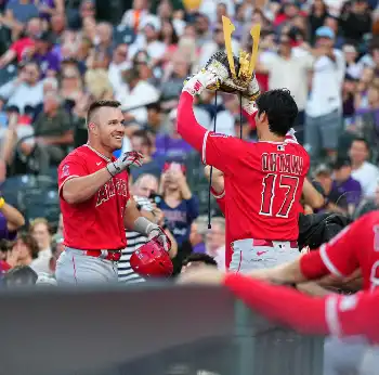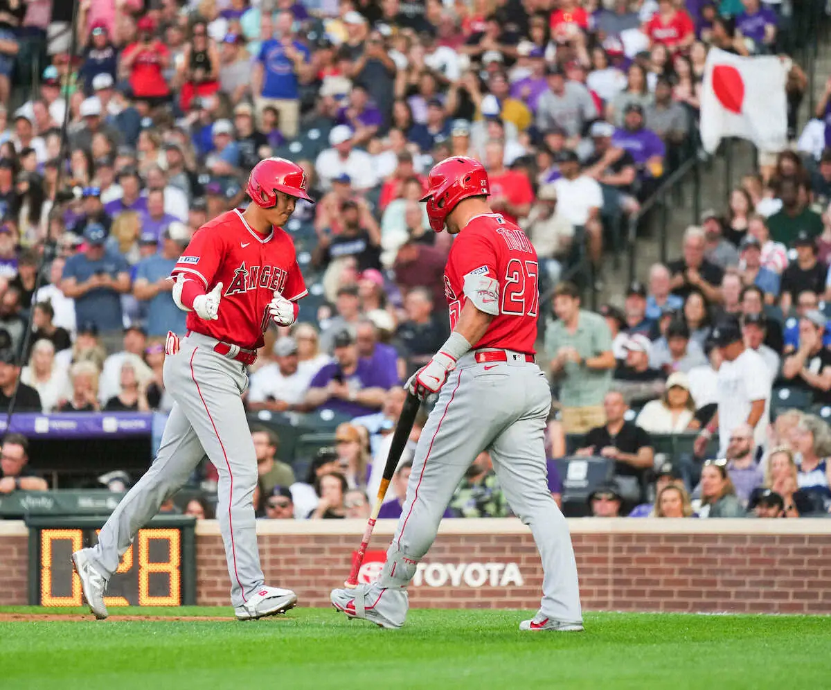 <ロッキーズ・エンゼルス>5回、ソロを放ったトラウト(左)は兜(かぶと)を手に出迎えた大谷に笑顔(撮影・沢田 明徳)